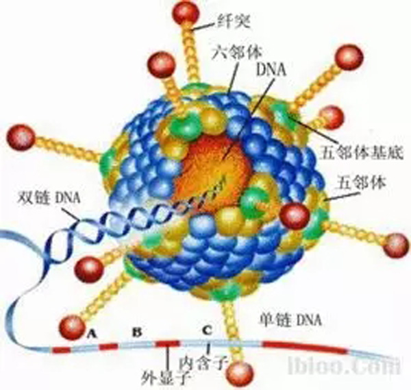 每個殼粒的直徑爲7~9 nm。衣殼裡(lǐ)是線狀雙鏈DNA分子,約含4.7kb,兩(liǎng)端各有長(cháng)約100 bp的反向(xiàng)重複序列